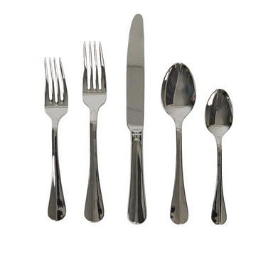 Includes: Dinner Fork (8.5"L), Salad Fork (7.5"L), Dinner Knife (10"L), Place Spoon (7.5"L), and Teaspoon (7"L).