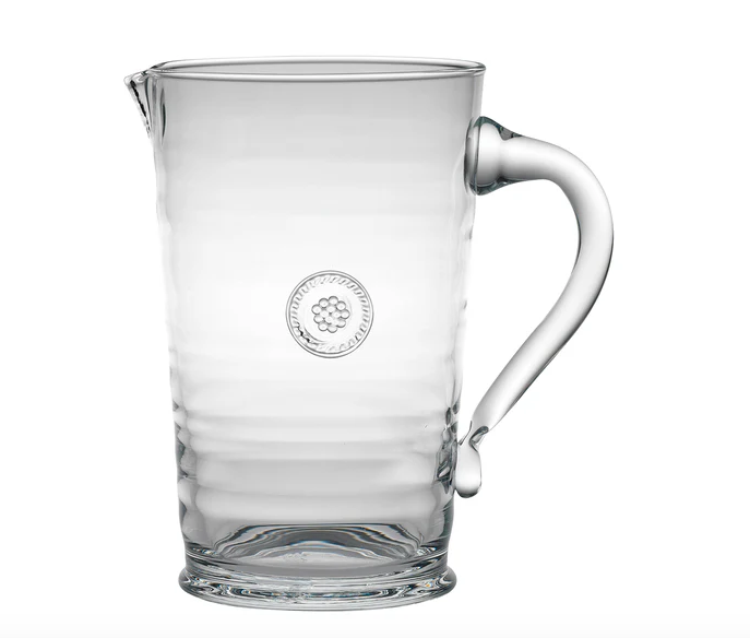 This mouth-blown pitcher is adorned with a single berry and thread medallion for a pop of elegance. Sturdy yet beautiful, it's perfect for serving fresh juice or for displaying fresh flowers. Holds 14 oz. 8.0"L x 5.25"W x 8.5"H
